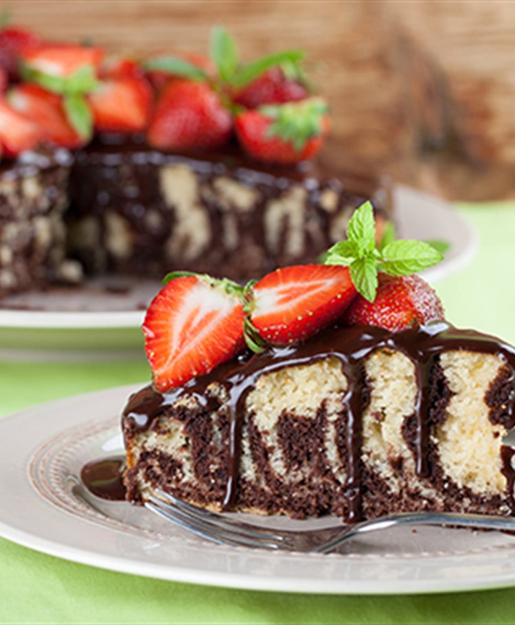 Spread chocolate sauce generously over the cake, serve with sliced strawberries.